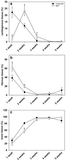 (a) Analysis of the ratio of cartilaginous tissue within the calluses of the fractured femora at 1, 2, 3, 4 and 5 weeks after fracture in young adult (black circles, n = 10) and aged (white circles, n = 10) CD-1 mice (Mann–Whitney U test used at 1, 3, 4 and 5 weeks, Student’s t-test used at 2 weeks). (b) Analysis of the ratio of fibrous tissue within the calluses of fractured femora at 1, 2, 3, 4 and 5 weeks after fracture in young adult (black circles, n = 10) and aged (white circles, n = 10) CD-1 mice (Student’s t-test used at 1 week, Mann–Whitney U test used at 2, 3, 4 and 5 weeks). (c) Analysis of the ratio of bone tissue within the callus tissue of fractured femora at 1, 2, 3, 4 and 5 weeks after fracture in young adult (black circles, n = 10) and aged (white circles, n = 10) CD-1 mice (Student’s t-test used at 1 and 2 weeks, Mann–Whitney U test used at 3, 4 and 5 weeks). Means ± SEM; * p < 0.05 vs. young adult.