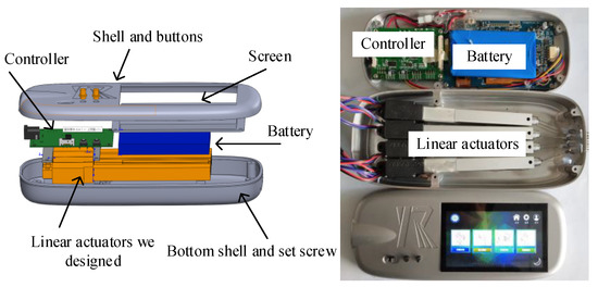 The system components are shown in Figure 3. The compact and lightweight design of the wearable glove makes it easy to use for patients, and the system’s portability allows it to be used in various settings, including clinical and home-based settings. The main control module, which includes the linear actuators, battery, hardware, and screen, was specifically designed to be portable and wearable, allowing for a more flexible patient rehabilitation experience. The separation module is an essential system component, effectively combining the central control and the rehabilitation gloves. This approach makes managing and using the system in various settings easier and enhanced its overall portability and ease of use.