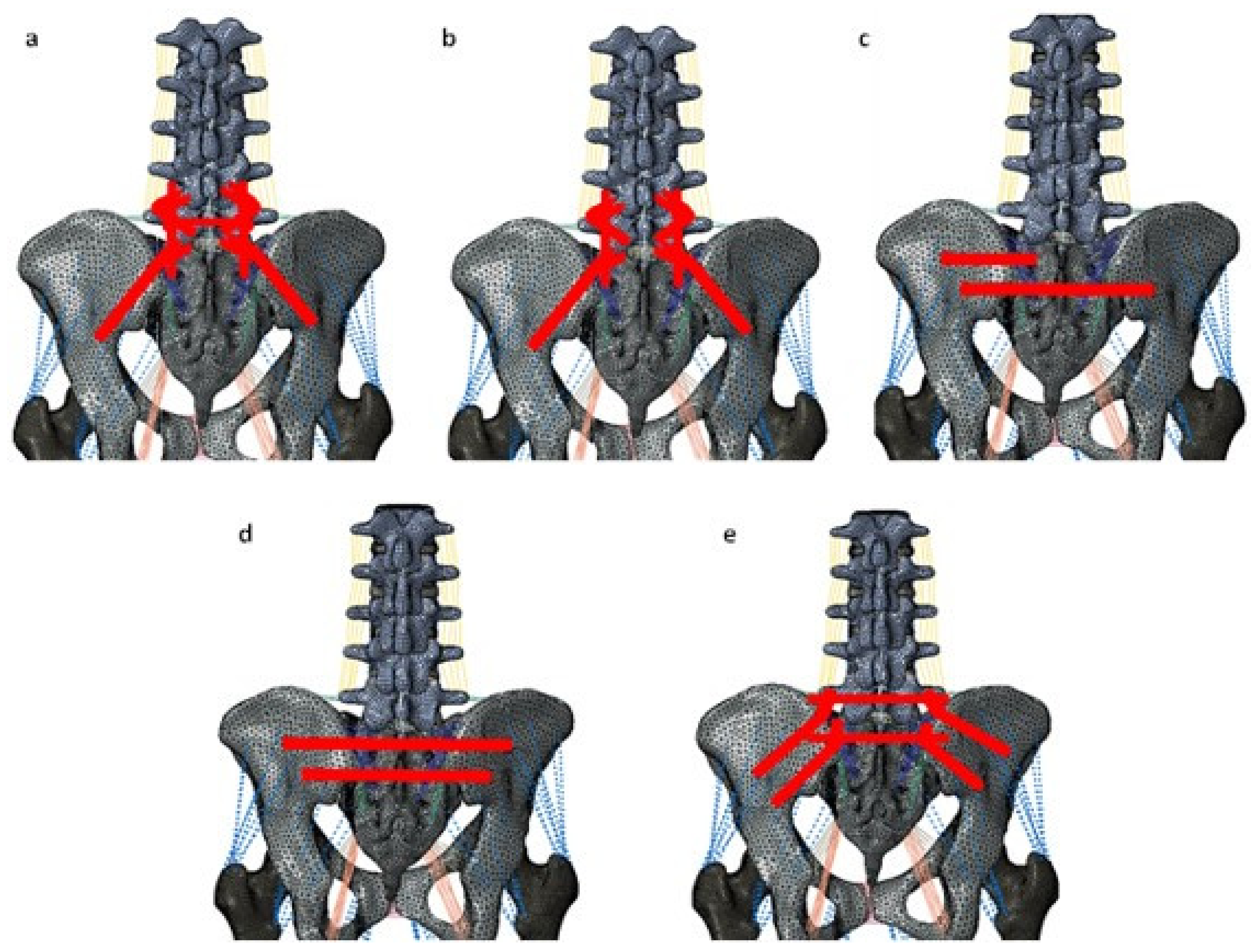 - Wu, T.; Ren, X.; Cui, Y.; Cheng, X.; Peng, S.; Hou, Z.; Han, Y. Biomechanical study of three kinds of internal fixation for the treatment of sacroiliac joint disruption using biomechanical test and finite element analysis. J. Orthop. Surg. Res. 2018, 13, 152. [Google Scholar] [CrossRef] [PubMed]