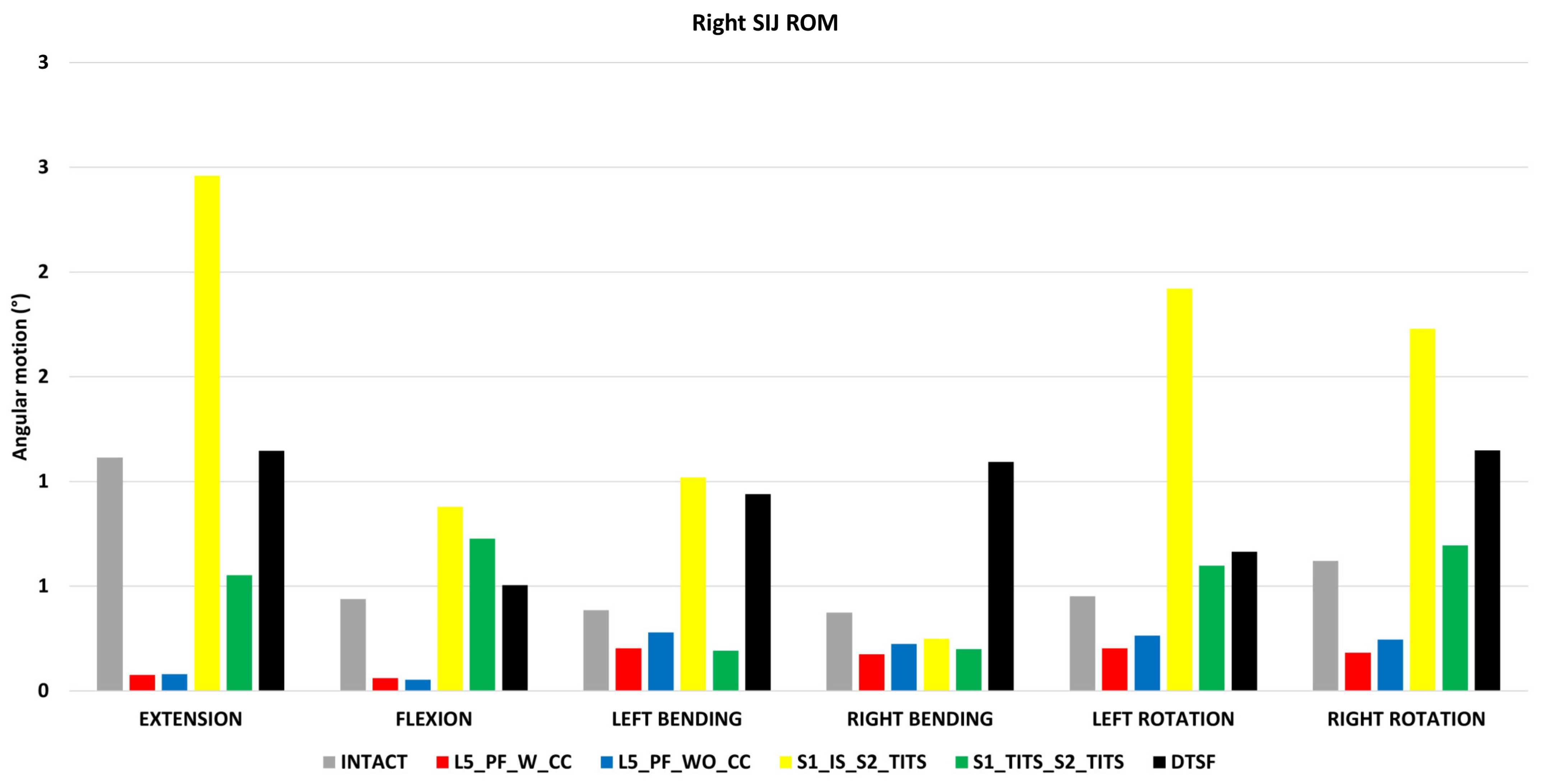 - Lindsey, D.P.; Kiapour, A.; Yerby, S.A.; Goel, V.K. Sacroiliac Joint Fusion Minimally Affects Adjacent Lumbar Segment Motion: A Finite Element Study. Int. J. Spine Surg. 2015, 9, 64. [Google Scholar] [CrossRef] [PubMed]