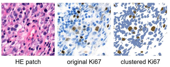 Example of corresponding HE patch, original Ki67 patch, and clustered Ki67 patch. The Ki67 index is equal to 0.1 [].