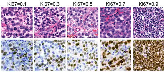 Histopathology involves the examination of tissue sections stained by different methods using light microscopy to identify signs of disease []. Histopathological analysis represents a condition sine qua non in cancer diagnosis, tumour exact classification, and subsequent treatment recommendations. Tissue staining is a technique that applies one or more dyes to tissue sections in order to enhance contrast and help pathologists identify different diagnostically relevant morphological features of the examined cells. Hematoxylin and Eosin (HE) staining is a gold standard in tissue cancer diagnosis which highlights different microscopically evaluable pathological changes of cancer cells different from those of normal cells in a stained tissue section. Immunohistochemical (IHC) stainings are used to specify the type of cancer by employing antibodies to detect lineage and/or differentiation and prognostic-specific antigens (markers) within cancer tissue sections. In addition, the Ki67 antigen serves as a marker of cell proliferation for assessing Ki67-positive cells that are abnormally growing and dividing, thereby possibly indicating the rate of tumour growth. The Ki67 index quantifies the expression of Ki67-positive cells by calculating the percentage of positive cancer cells in a tissue section. Evaluation of the Ki67 index represents a mandatory step in the cancer diagnostic algorithm; however, IHC Ki67 staining has high demands in terms of resources and time, and its evaluation is more time-consuming than that of HE staining.