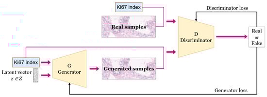 We utilised the generative model introduced in our earlier work [], which is a conditional StyleGAN model that generates HE-stained image patches conditioned on the Ki67 index. The architecture of the conditional generative model is illustrated in Figure 4. It takes a latent vector as input and uses a specified Ki67 index to condition the generation of the HE-stained patches.