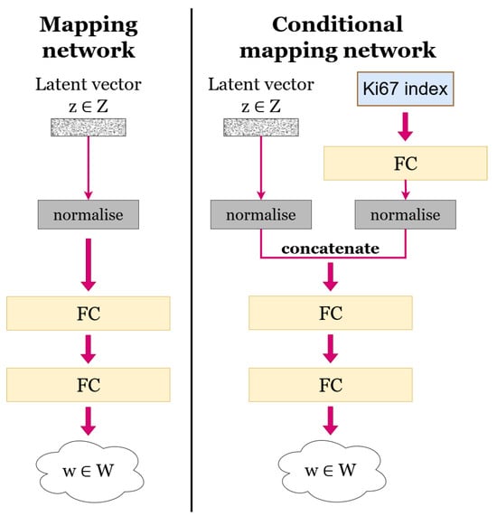 Conditioning is applied within the StyleGAN mapping network following the official implementation by NVlabs []. Figure 5 compares the traditional unconditional mapping network (left) with the conditional version (right). In the conditional mapping network, the Ki67 index is first passed through a fully connected (FC) layer to produce a vector with the dimension of the intermediate latent space W. This vector is then normalised in the same way as the input latent vector z. The two vectors are concatenated and passed through two FC layers, as in the original mapping network, resulting in the final intermediate latent vector .