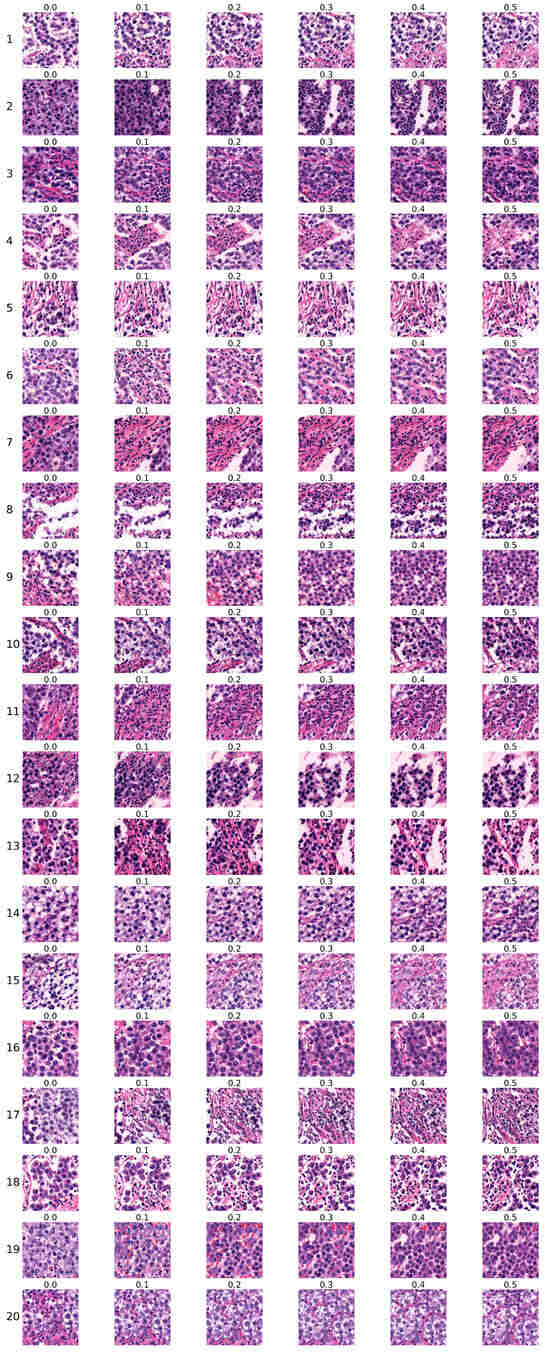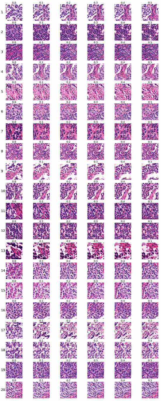 To analyse the Ki67 expression within HE-stained images, we generated sequences of HE images that correspond to varying Ki67 index values. This approach allowed us to scrutinise how variations in the Ki67 index are reflected in HE-stained images, providing insights into potential correlations between HE staining patterns and Ki67 expression. Due to the insufficient number of images in the dataset with Ki67 indices above , we focused this analysis exclusively on Ki67 index values ranging from 0 to in order to ensure reliable results. Furthermore, sequences with Ki67 indices above were evaluated by pathologists as being less realistic.