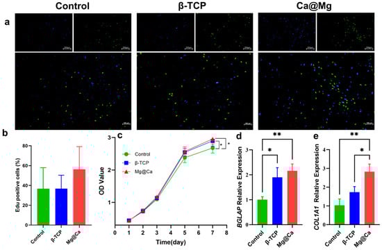 The osteogenic properties of bioceramic scaffolds. (a) EdU staining for evaluation of the influences of three groups on the proliferation of h-BMSC. The new generation cells were detected via EdU (green). DAPI stained nuclei in blue. Merged view of EdU (green) and DAPI (blue) showing the overlap. (b) Quantitative analysis results of EdU staining using GraphPad Prism 9.0.0 software (La Jolla, CA, USA). (c) Quantitative analysis results of CCK-8 staining. (d) BGLAP and (e) COL1A1 expression of h-BMSCs cultured with blank medium, β-TCP medium, and Mg@Ca medium evaluated by qPCR. Data are presented as mean ± s.d. (n = 5). * p < 0.05, ** p < 0.01 (one-way ANOVA).
