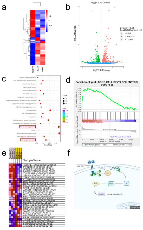 (a,b) The heatmap and volcano plot of the differentially expressed genes identified by transcriptome sequencing. The up−regulated genes are marked in red, and the down−regulated genes are marked in green. Cutoff: p−value < 0.05 and |log2 FC| > 1. (c) Top 20 signal pathways enriched by differentially expressed genes using KEGG analysis. The red boxes highlight the PI3K-Akt signaling pathway and ECM-receptor interaction pathway due to their critical roles in osteogenesis. (d) GSEA analysis from DisGeNET also indicated enrichment of DEGs in pathways related to BONE CELL DEVELOPMENT. (e) DEGs specifically expressed in the Mg@Ca group. Red typically indicates higher gene expression levels, while blue indicates lower gene expression levels across different samples. The identified differentially expressed genes enriched in (f) PI3K−Akt signaling pathway on the transcriptome sequencing and IPA 24.0.2 software analysis (created with BioRender.com).