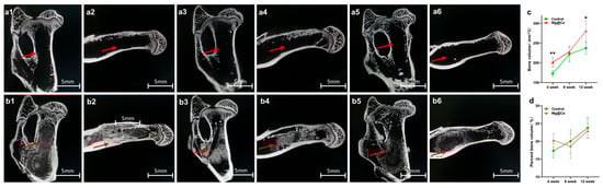 Mg@Ca efficacy in the treatment of rabbit ONFH model: (a1–a6) Micro-CT scans of the osteonecrosis of the femoral head in the blank group at (a1,a2) 4 weeks, (a3,a4) 8 weeks, and (a5,a6) 12 weeks. The tunnels created by Kirschner (shown by the red arrows) wire remained continuously in the subcapital region. (b1–b6) Micro-CT scans of the osteonecrosis of the femoral head in the Mg@Ca group at (b1,b2) 4 weeks, (b3,b4) 8 weeks, and (b5,b6) 12 weeks. Mg@Ca within the tunnels was gradually absorbed and replaced by newly formed trabecular bone (shown by the red arrows). (c) Quantitative analysis results of bone volume using GraphPad Prism 9.0.0 software. (d) Quantitative analysis results of percent bone volume. Data are presented as mean ± s.d. (n = 3). * p < 0.05, ** p < 0.01 (one-way ANOVA).