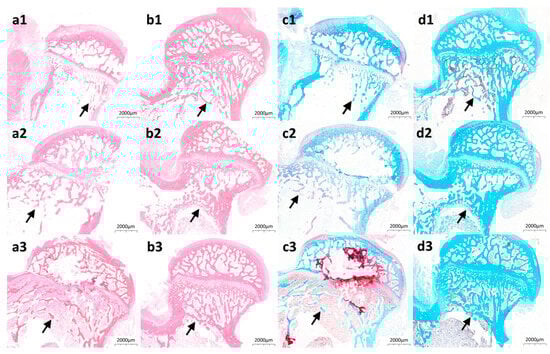 Hematoxylin-eosin and safranin O-fast green staining directly visualized bone structural organization in Mg@Ca-treated tunnels. Acidophilic bone tissue exhibited eosin affinity (red staining, Figure 5(a1–a3,b1–b3)), while basophilic components demonstrated fast green binding (blue staining, Figure 5(c1–c3,d1–d3)). Mg@Ca-treated specimens (Figure 5(b1–b3,d1–d3)) displayed progressive increases in reticular trabeculae within subcapital tunnels. Comparative analysis revealed superior trabecular density and thickness in Mg@Ca-treated tunnels relative to controls (Figure 5(a1–a3,c1–c3)), demonstrating Mg@Ca’s capacity to enhance osseous regeneration. We provide an “histology images” folder that includes more original, unformatted images in the Supplementary Materials.