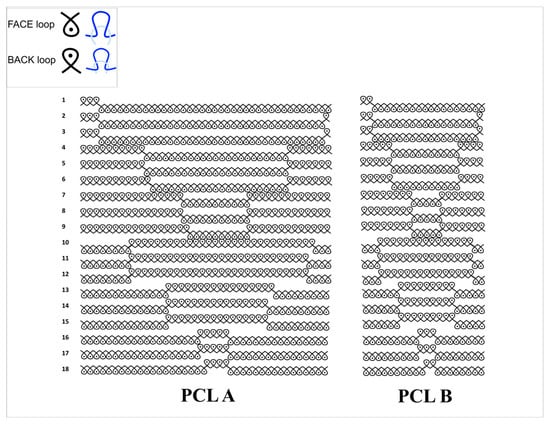 Knitting design notations of scaffold samples PCL A (left) and PCL B (right). The inset on the top left explains the actual appearance of the components in the design notations in terms of face loop and back loop.