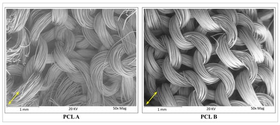 Scanning electron microscope images of scaffolds PCL A and PCL B. The average pore size was determined from the width of each pore always measured in the same direction. A total of 50 pore size dimensions from five different images of each scaffold sample were measured and averaged. The arrows show the direction of measurement for each of the SEM images.