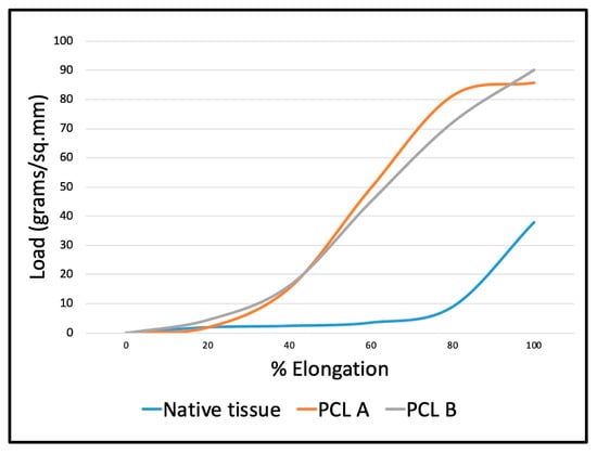 Comparison of load-elongation curves for the scaffolds PCL A and PCL B obtained from the probe puncture test compared to that of the abdominal skeletal muscle of mammals.