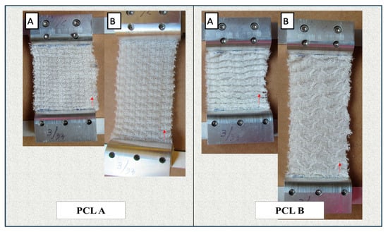 Figure 5 shows the changes in dimensions of the scaffolds during manual lengthwise extension. Table 4 compares the change in dimensions and volume of the two scaffolds before and after extension in order to determine their dimensional stability in the lengthwise direction. We observed that both scaffolds showed a high extension in length before any crosswise shrinkage was observed in the width. Also, PCL A showed a 61.8% increase in volume at 76% extension, while PCL B showed an increase of 8.4% in volume at more than 150% extension. This confirms that both scaffolds had a negative Poisson’s ratio during more than 50% extension, which ensures that neither scaffold experienced lateral shrinking during initial extension, which is different from most conventional fabric structures.