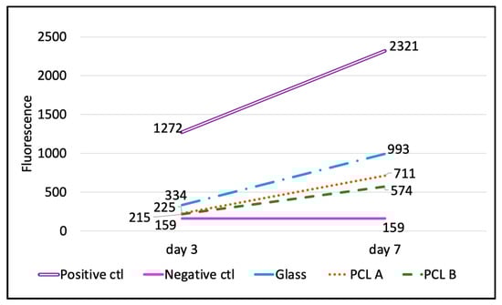 Figure 6 compares the increasing rate of cell metabolic activity in terms of the fluorescence values for all three biomaterials with that of the positive and negative controls. The image supports the claim that the scaffolds encouraged cell proliferation between Day 3 and Day 7, but when compared to the positive control and to the glass coverslips, the scaffolds held a lot of scope for improvement in cell adhesion.
