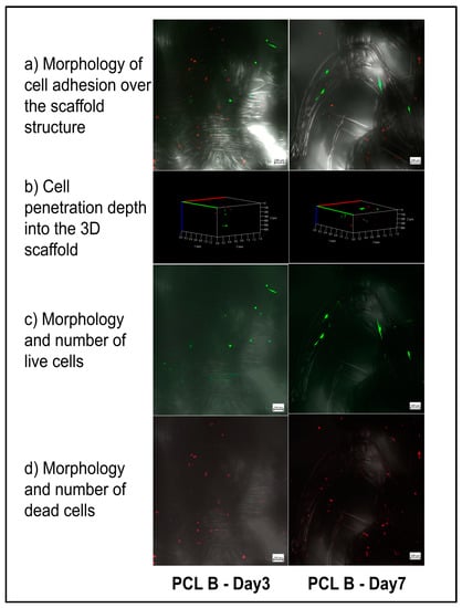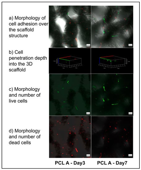 Figure 7 describes the comparison of cell attachment on and within the three-dimensional PCL. We attempted to visualize the proportion of viable cells to dead cells and the migration of cells through the scaffolds between Day 3 and Day 7. It can be seen from Figure 7a that the cells attached to the individual filament surfaces favored residing in the space between the filaments and not in the pores between yarns. Figure 7b shows that the cells penetrated up to a distance of 450 microns deep into the three-dimensional scaffold, both at Day 3 and Day 7. This shows that the morphology and structure of the scaffolds helped the cells to be distributed up to 450 microns into the scaffolds, but no deeper. The depth of cell penetration could have been influenced by the initial cell seeding density or by differences in the scaffold structure that affects cell seeding or migration. Figure 7c,d visually compares the proportion of live and dead cells on the scaffold sample PCL A between Day 3 and Day 7. The live cells were observed to be well attached and elongated on Day 7, but there was no difference between Day 3 and Day 7 dead cells, which supported the results obtained from the alamarBlue® assay.