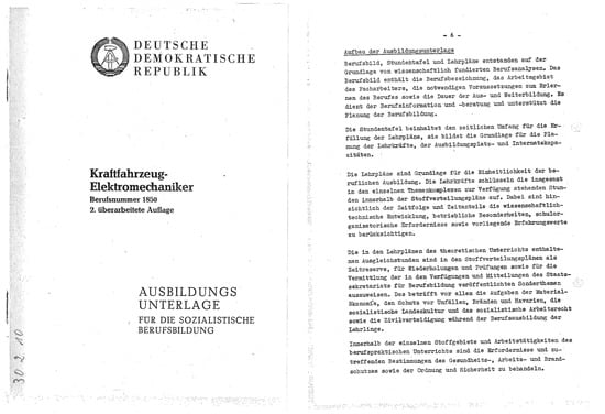Regulation documents of the German Democratic Republic for electrical mechanical engineers for vehicles (Kraftfahrzeug-Elektromechaniker): cover page (left) and a page describing the curriculum (right). Documents are usually written with typewriters.