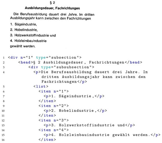 Once the scans are deskewed, denoised, and binarized, the image files are passed to the tesseract OCR engine to create hOCR files that contain the text recognized in the images, as well as layout information about the text. This information is used to structure the data contained in that text. In addition to the generated PDF files that now contain text, the text is converted to a TEI-XML file that further structures the text and adds some meta information such as title, year of publication, converts lists to enumerations, and allows headings to be defined in the text. Figure 2 shows an example output.
