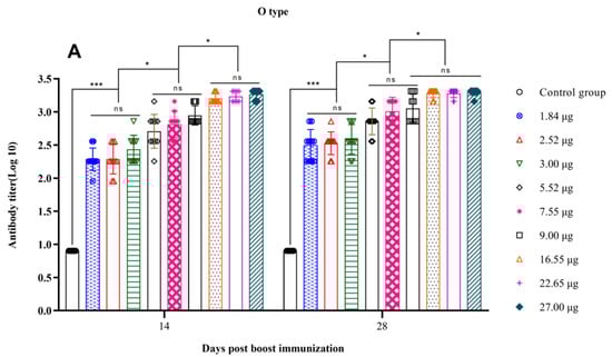 The antibody titers in log base 10 of type O and A following primary immunization at different days post-vaccination with varying 146S doses in the administered vaccines.
