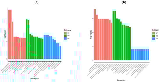 A volcano plot was generated to visualize the distribution of DEGs for each comparison combination (Figure 3b,c). The abscissa in the graph represents the fold change in gene expression (log2 FoldChange) in the treatment and control groups, whereas the ordinate represents the genes in the treatment and control groups. The significance of the differences in expression levels is given by the −log10 padj or −log10 p value. In Figure 3, upregulated genes are represented by red dots, and downregulated genes are represented by green dots.