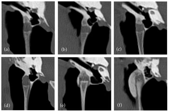 An illustration of the grades of temporohyoid joint. (a) Grade 0 shows no new bone formation. (b–d) all show Grade 1 temporohyoid joints; however, they illustrate the variation within this grade; (b) shows new bone formation not crossing the joint, while (c,d) show different degrees of new bone formation both crossing the medial aspect of the joint. (e) Grade 2. (f) Grade 3.