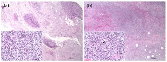 Histologic findings of subcutaneous lymphoid lesions. Hematoxylin and eosin (H&E) staining: (a) Case 1: the nodules are composed of mixed infiltrates of lymphocytes, histiocytes, and macrophages; (b) Case 2: the nodules predominantly consist of neoplastic lymphocytes with occasional histiocytes/macrophages and plasma cells. Scale bars = 500 μm and 50 μm (inset).