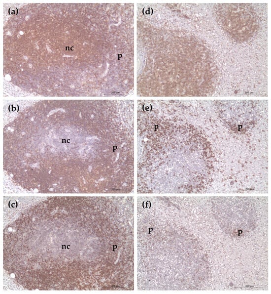 Immunohistochemical staining of neoplastic cells: (a–c) Case 1: the nodular periphery (p) shows strong positivity for CD20 (b) and PAX5 (c), with a few CD3-positive (a) lymphocytes observed within the center of the nodules (nc); (d–f) Case 2: CD3+ T-cell infiltration is evident (d), with scattered CD20+ (e) and PAX5+ (f) lymphocytes at the periphery (p). Scale bars = 200 μm.