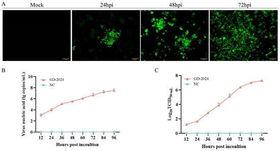 (A) IFA revealing the reactivity of a monoclonal antibody against the CSFV E2 protein from GD-2024 at 24, 48, and 72 h post-infection. Scale bars indicate 100 µm. (B) GD-2024 viral titer detection at 12, 24, 36, 48, 60, 72, 84, and 96 hpi. (C) Growth kinetics of GD-2024.