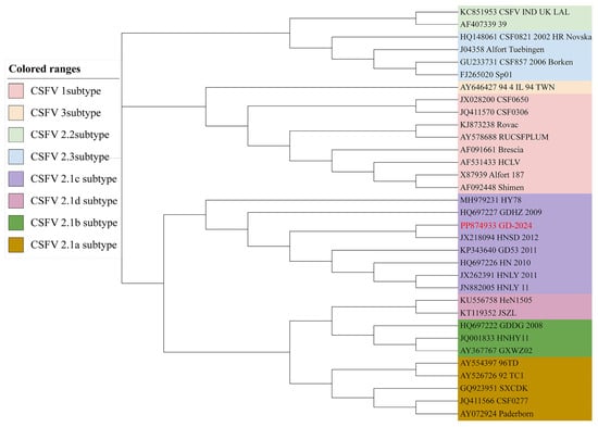 Phylogenetic tree based on the complete E2 sequences of 33 CSFV strains, constructed using the NJ method in MEGA 11.0 software.