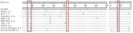 5′UTR sequence comparison of GD-2024 isolate and nine reference isolates. Some mutations or deletion regions of these isolates are indicated by red boxes and are described in detail in the text.