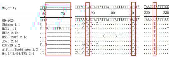 Sequence comparisons illustrated that the 3′UTR of GD-2024 had mutations at positions 87 (T to C), 111 (T to A), and 224 (T to C) compared with the other subgenotypes (Figure 5). The vaccine strain HCLV contained a 12-nucleotide (CTTTTTTTCTTTT) insertion at nucleotides 61–62 compared with the other subgenotypes.