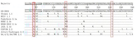 Amino acid sequence comparison of the E2 gene between the GD-2024 isolate and nine reference isolates. Some mutations or deletion regions of these isolates are indicated by red boxes (□) and are described in detail in the text.