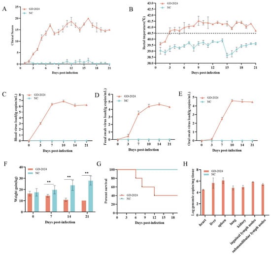 Piglets in the challenge group exhibited typical clinical symptoms of swine fever virus infection, including anorexia, depression, chills, movement disorders, diarrhea, and high fever. Such symptoms were not observed in the control group. The CS of pigs infected with the GD-2024 strain was 15–25, indicating high virulence (Figure 7A). In addition, on the third day after viral challenge, the piglets displayed obvious fever symptoms, with a rectal temperature exceeding 40.5 °C and peaking at 9 days post-infection (dpi) (Figure 7B). Conversely, the piglets in the control group maintained a normal body temperature throughout the observation period, with a rectal temperature of 38.5–39.9 °C. Oral swabs, fecal swabs, and anterior vena cava blood samples were collected on days 0, 3, 7, 10, 14, and 21 dpi for detoxification monitoring and viremia monitoring. Results indicated rapid viremia increase at 3 dpi, peaking at 10 dpi. At the same time, viral nucleic acid was detected in both oral and anal swabs, indicating that GD-2024 can cause high levels of viremia and shed orally and in feces (Figure 7C–E). Body weight gradually decreased throughout the observation period in the challenge group, whereas the weight of piglets in the control group increased normally (Figure 7F). During the experimental period, one piglet each died at 6, 8, 12, and 20 dpi in the challenge group, but no piglets died in the control group. The survival rate of piglets was 40% in the GD-2024 group, compared with 100% in the blank control group (Figure 7G).