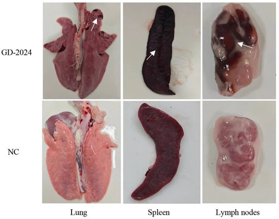 Representative gross lesions in the pigs inoculated with the CSFV GD-2024 strain. The ocular lesions observed in the GD-2024 challenge group exhibited solid lesions in the lungs, infarcts in the spleen, and hemorrhages in the lymph nodes. In contrast, the control group did not exhibit any lesions. The white arrow indicates the location of the tissue lesion.