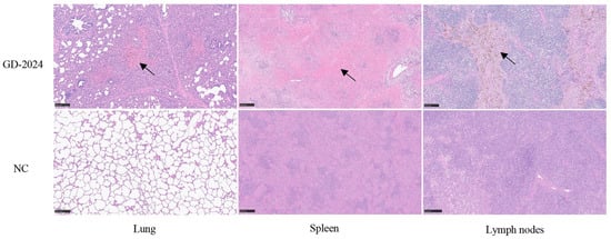 Post-experiment, euthanized pigs were examined for organ viral load, with spleens showing the highest viral load (≥106 copies/mg), followed by lymphoid tissues and livers (104–106 copies/mg) (Figure 7H). Ocular lesion results indicated severe solid lesions in the lungs of mice in the challenge group (Figure 8), with the whole lung being dark red and the lobules exhibiting reddish-brown solid lesions. Foci of infarctions of varying sizes were observed on the surface and margins of the spleen, and the whole spleen was dark black. Additionally, the lymph nodes were severely hemorrhagic and enlarged. There were no lesions in the control group. Further HE staining and pathological section analysis indicated that the alveolar cell spaces disappeared, and a large amount of inflammatory infiltration was present (Figure 9). The spleen was obviously hemorrhagic, the medulla was blurred, the lymphocytes were obviously reduced in number with an increased density, and a small number of nuclear schizophrenic images were observed. The lymph nodes were vasodilated with erythrocyte leakage, the lymphocytes were necrotic and collapsed, lymphocyte counts in the germinal center were reduced, and a small number of nuclear schizophrenic images were observed. The test results illustrated that the GD-2024 strain could cause severe tissue damage and lesions in pigs.