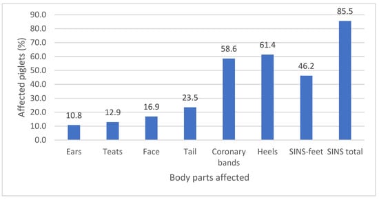 The presence of signs of SINS was identified in piglets across all herds, though the prevalence of clinical signs exhibited by individual farms exhibited significant variation. According to the herd, the percentage of piglets displaying SINS signs was as follows (mean ± SD (minimum–maximum)): Tail: 23% ± 12.6% (5–50.7%); ears: 12.7% ± 8.2% (3.8–26.4%); face: 15.3% ± 11.8% (3.9–45.4%); teats: 9.6% ± 5.2% (0.8–18.8%); coronary bands: 59.0% ± 14.1% (35.6–89.3%); heels: 69.3% ± 15.4% (34.5–91.8%). The percentages of SINS with and without consideration of the feet were 47.1% ± 13.1% (20.2–68.1%) and 86.5% ± 7.8% (68.5–95.6%), respectively.