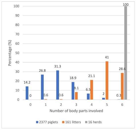Percentage of piglets, litters and herds with 0 to 6 body parts simultaneously affected by SINS signs. The bars show the percentage of piglets (blue), litters (orange) and herds (grey) exhibiting SINS signs on 0, 1, 2, 3, 4, 5 or 6 body parts. The respective percentages are shown above the bars.