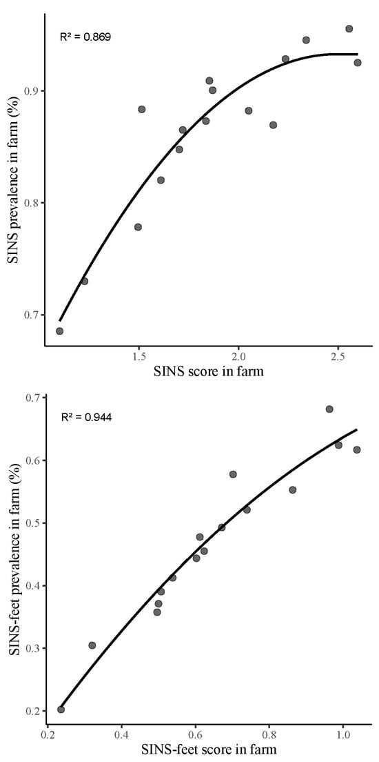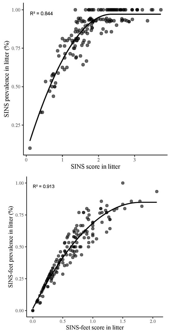 The prevalence of SINS signs in a litter was closely correlated with its average SINS score (r = 0.92, p < 0.001) (Figure 4). At the farm level, the correlation between SINS prevalence and SINS score was 0.96 (p < 0.001) (Figure 5). The present study found a strong correlation between score and prevalence with regard to SINS-feet, with a value of 0.93 (p < 0.001) at the litter level and 0.97 (p < 0.001) at the herd level. This finding suggests a consistent correlation between higher prevalence rates and higher SINS scores at both the litter and herd levels.