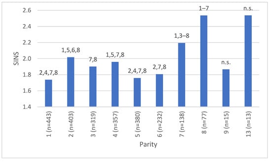 Association between SINS score and parity. Numbers above bars indicate significant differences between parities (p < 0.05); n = number of piglets with SINS scores.