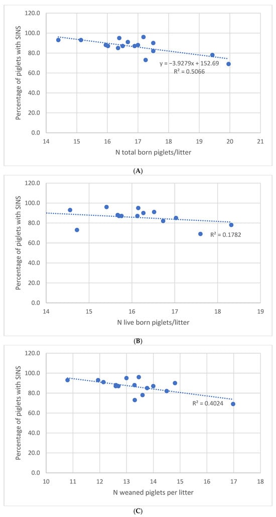 The relationship between the percentage of piglets affected by SINS and the total number of piglets born (A), the number of piglets live born (B) and the number of weaned piglets (C) per herd. The linear regression line and the coefficient of determination (R2) for each relationship are integrated.