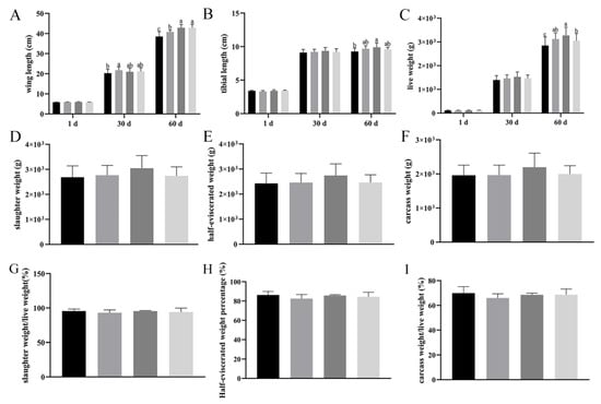 Effect of Bacillus subtilis and bacteriophage on slaughtering performance. (A) Wing length at 1, 30, and 60 d. (B) Tibial length at 1, 30, and 60 d. (C) Live weight at 1, 30, and 60 d. (D) 60 d slaughter weight. (E) Statistical results of 60 d half-eviscerated weight. (F) 60 d carcass weight. (G) Statistical results of slaughter weight percentage at 60 d. (H) Statistical results of half-eviscerated weight percentage at 60 d. (I) Statistical results of carcass weight percentage at 60 d. Black—control group; grey—bacteriophage group; dark grey—Bacillus subtilis group; light grey—mix group. Values with different superscript letters are significantly different (p < 0.05).