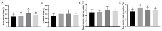 Effect of Bacillus subtilis and bacteriophage to skeletal muscle weight and its ratio to slaughter weight. (A) Breast muscle weight at 60 d. (B) Leg muscle weight at 60 d. (C) Statistical results of breast muscle weight percentage at 60 d. (D) Statistical results of leg muscle weight percentage at 60 d. Black—control group; grey—bacteriophage group; dark grey—Bacillus subtilis group; light grey—mix group. Values with different superscript letters are significantly different (p < 0.05).