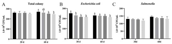 Escherichia coli content was significantly lower in treatment groups (B, C, D) than in group A at 30 d, and significantly lower in group D than in groups A, B, and C at 60 d (p < 0.05) (Figure 3B).