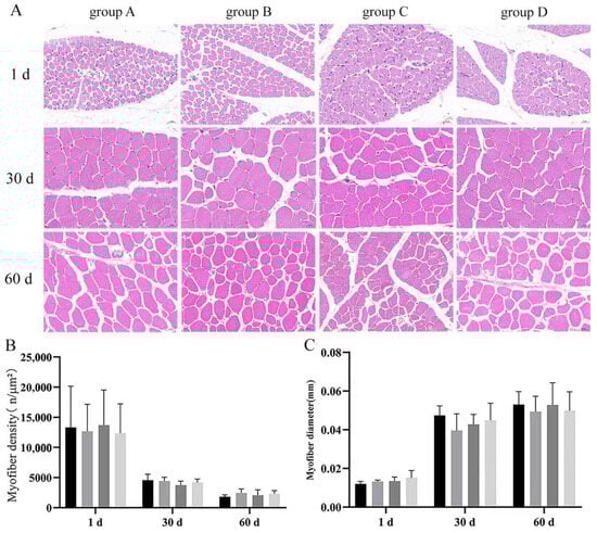 At days 1, 30 and 60, tissue blocks of the breast muscle superficialis muscle and leg muscle were removed, which were still attached to the bone, were cross-sectioned perpendicular to the orientation of the myofibers, and the cross-sectional area was traced on a transparent paper []. The sampling site for the leg muscle is the gastrocnemius muscle, and the sampling site for the breast muscle is a cross-section of the entire muscle. Skeletal muscle from 6 geese of 1, 30, and 60 d were utilized. Sections were processed by hematoxylin and eosin staining. A 20.0× image of muscle tissue was captured for each section on CaseViewer 2.2 scanning and viewing software. The micrographs were taken with the Axio Imager Z1 (ZEISS), zooming in 400× for each area. One field of view was selected for each of the three biological geese of each species in each period for the statistics. Then, 3 randomly selected fields of view per slice from 6 slices were photographed for each section, 6 myofibers or muscle bundles were randomly selected for each view, and the diameter of the myofibers (μm) or the cross-sectional area of the muscle bundles (μm2) was measured and averaged. The number and diameter (μm) of all myofibers in the field of view of the section were counted using Adobe Photoshop 2021, and the density was calculated by the number and field area of the section. The total number of myofibers was calculated by myofiber density and cross-sectional area.