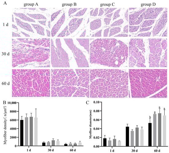 Skeletal muscle is an important criterion for judging the performance of poultry production; to explore the difference between two treatments, we performed H&E-stained section analysis. Results indicated that there were no significant differences (p > 0.05) in the breast muscle density or diameter among groups at every timepoint (Figure 5A). There were no significant differences (p > 0.05) in the leg muscle density of the groups at every timepoint. Moreover, there were no significant differences in the leg muscle myofiber diameter at 1 and 30 d (p > 0.05) (Figure 5B); leg muscle myofiber diameters were significantly higher in the treated groups (B, C, D) than in the control group (group A) at day 60, with group C having the highest. These results suggested that Bacillus subtilis and bacteriophage may not be effective on the leg muscle until after the middle of the fattening period (p < 0.05) (Figure 6C).