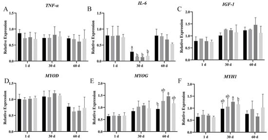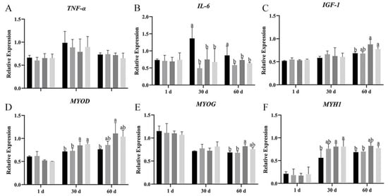 The mRNA relative expression of vital immunity and myogenic genes in leg muscle. The gene expression of (A) TNF-α, (B) IL-6, (C) IGF-1, (F) MYH1, (D) MYOD, and (E) MYOG in leg muscle. Black—control group; grey—bacteriophage group; thick grey—Bacillus subtilis group; light grey—mix group. Values with different superscript letters are significantly different (p < 0.05).