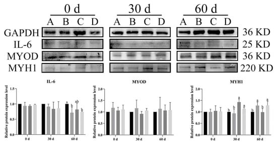 To illustrate the effects of dietary supplementation with Bacillus subtilis and bacteriophage on the expression level of inflammatory cytokines and myogenic proteins in Magang geese, Western blot analysis was used to evaluate IL-6 (inflammatory cytokine), MYOD, and MYH1 expression in both breast and leg muscles at different rearing stages (0, 30 and 60 days).