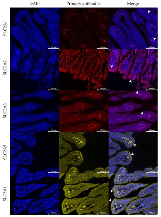 Immunofluorescence images of hexose transporter proteins (SLC2A1, SLC2A2, SLC2A3, SLC2A5, and SLC5A1) in the fetal jejunum. Sections were stained using specific primary antibodies, followed by Biotium secondary antibodies: Biotium 633 for SLC2A1, SLC2A2, SLC2A3, Biotium 568 for SLC2A5, and Biotium 555 SLC5A1. Nuclei were counterstained with DAPI. Representative images show the localization (indicated by white arrowheads) and relative abundance of transporters in villi. All images are at 200× magnification. The white scale bar on each image represents 100 μm.