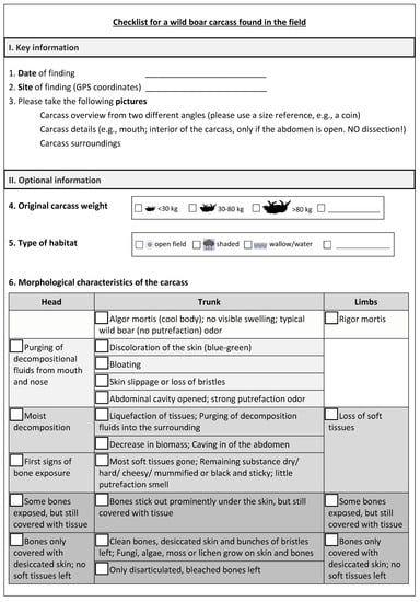 Proposed checklist for a wild boar carcass found in the field. The “key information” section includes the date and site of finding as well as the instruction to take photographs. Taking photographs is a simple and useful [] technique for illustrating what the carcass looked like and where it was found, e.g., in the forest, near a road or a lake. The place of discovery cannot only give clues about the PMI, but also about the mode of disease introduction and spread.