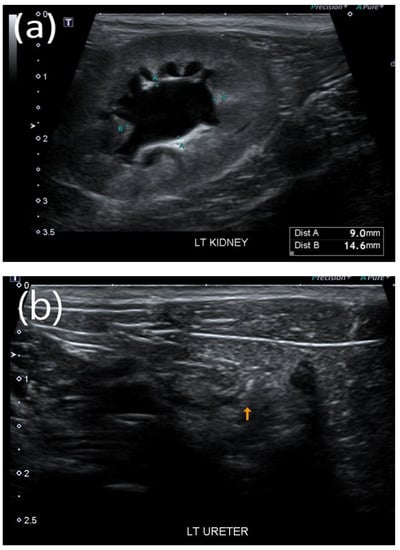- Kyles, A.E.; Hardie, E.M.; Wooden, B.G.; Adin, C.A.; Stone, E.A.; Gregory, C.R.; Mathews, K.G.; Cowgill, L.D.; Vaden, S.; Nyland, T.G.; et al. Management and outcome of cats with ureteral calculi: 153 cases (1984–2002). J. Am. Vet. Med. Assoc. 2005, 226, 937–944. [Google Scholar] [CrossRef] [PubMed]