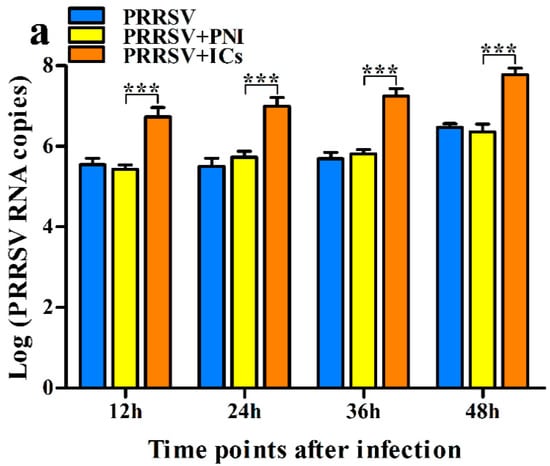 PAMs cell monolayer (5 × 105 cells) cultured in 24-well plates (Corning, NY, USA) was infected with 200 μL of PRRSV + PNI, PRRSV + ICs, or PRRSV containing 200 TCID50 at 37 °C. The cell supernatants were harvested in indicated time point to quantify viral RNA as previously reported real-time RT-PCR [] and measure virus titers using the Reed–Muench method.